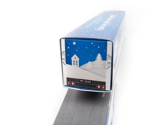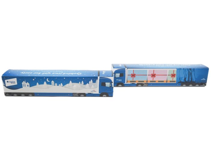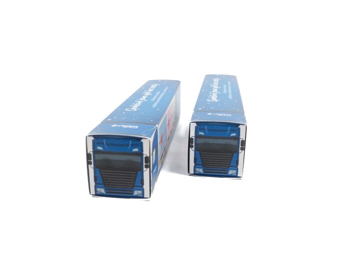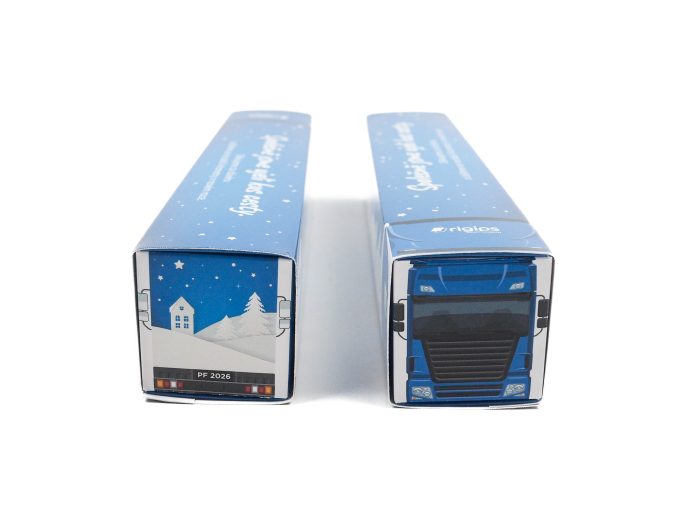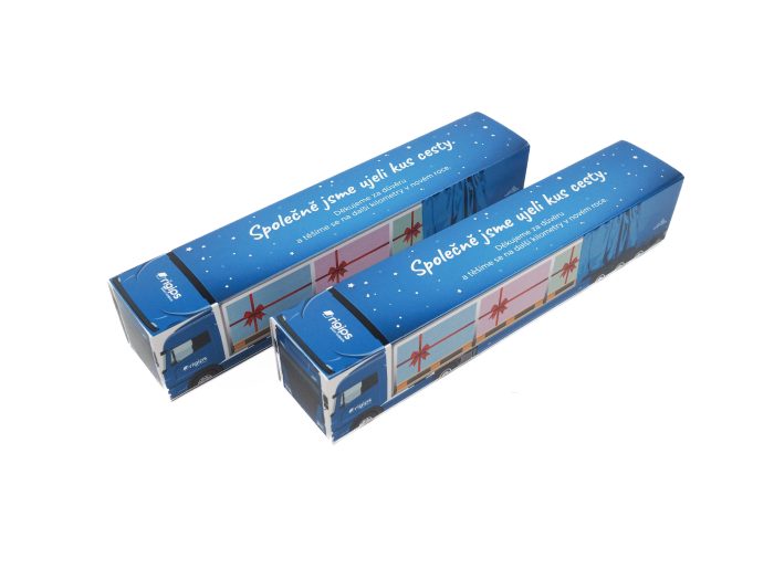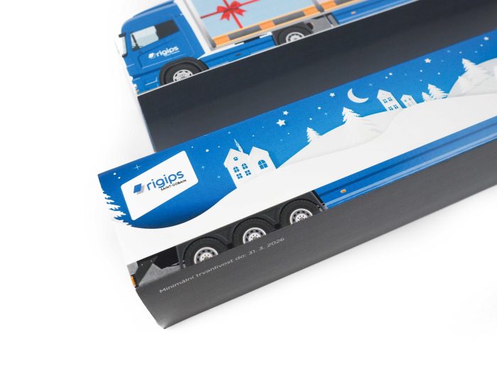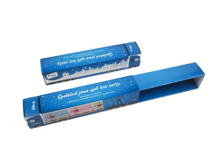 Dárková krabička ve tvaru kamionu byla vyrobena jako malá bonboniéra se speciálním vzhledem. Na tuto krabičku byla zvolena konstrukce krabičky na makronky a potisk zrcadlil export/import. Za nás toto balení patří mezi nejoriginálnější a i s malou změnou grafiky lze vykouzlit skvěle zabalený dárek.