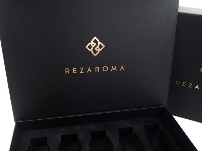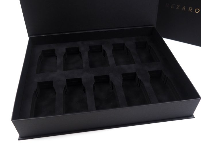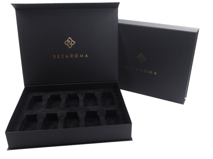 Tato magnetická krabice Rezeroma byla vyrobena na vzorky esenciálních olejů. Aby skleničky s oleji do vložky seděly, byla vložka vyřezána laserem dle tvaru produktu.